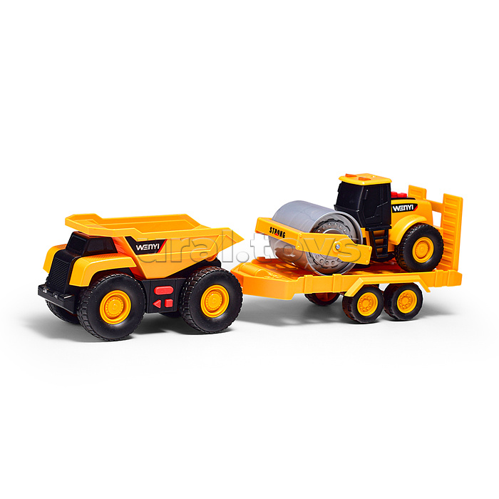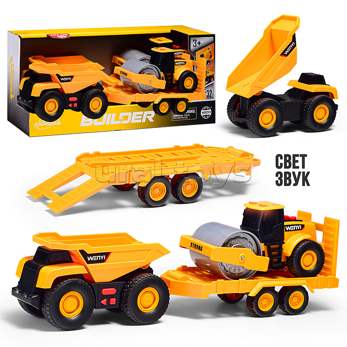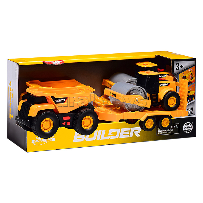 Машина "Бульдозер" с прицепои и катком, 1:32 (свет, звук) в коробке
