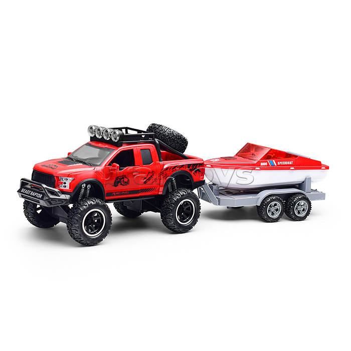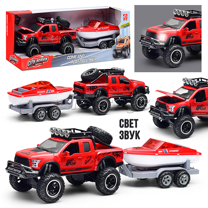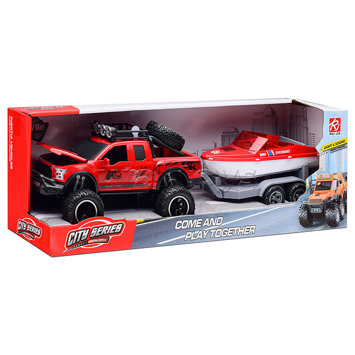 Машина с прицепом и лодкой (свет, звук) в коробке