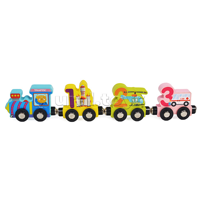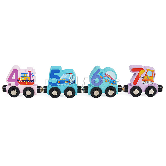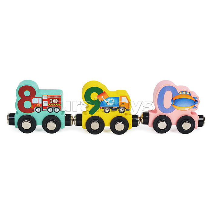 Игрушка включает 11 разноцветных вагончиков, каждый из которых украшен цифрой от 0 до 9 и один паровозик