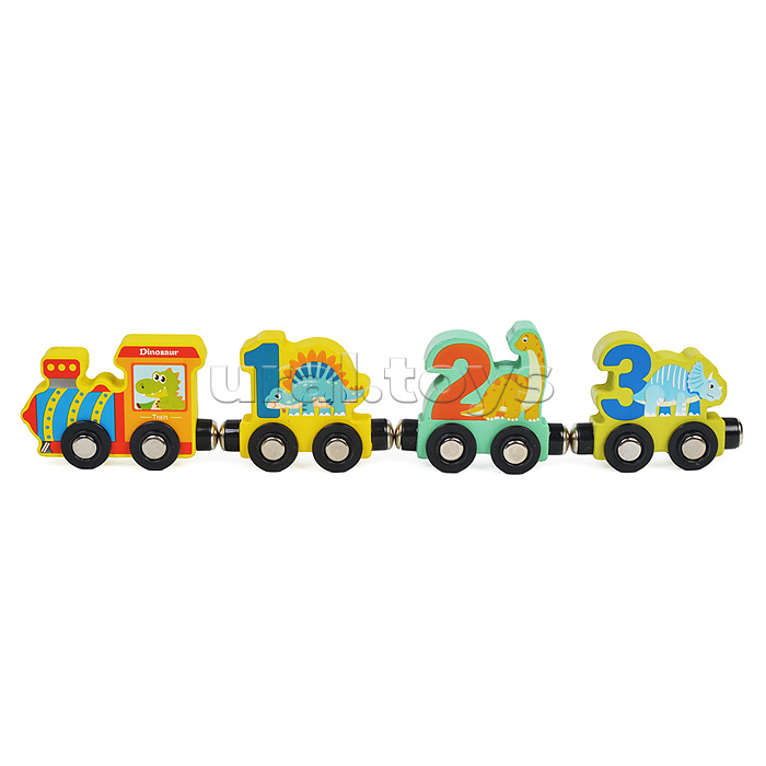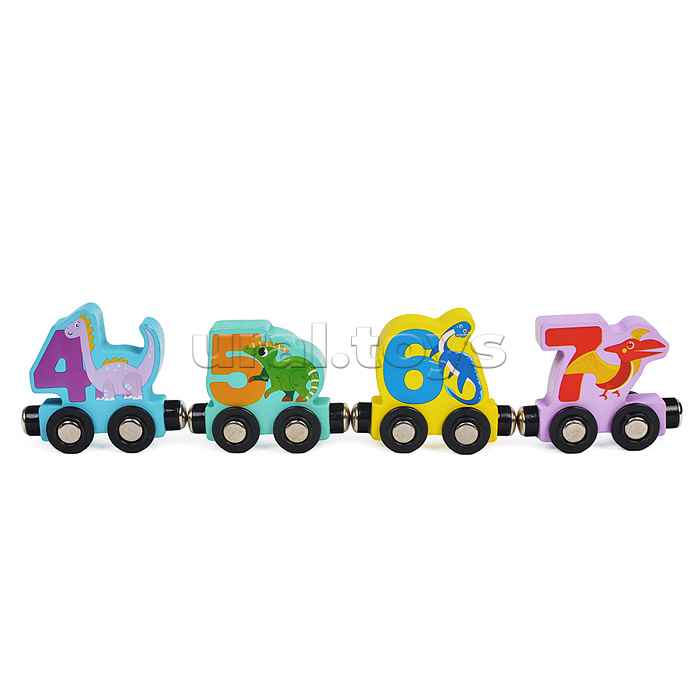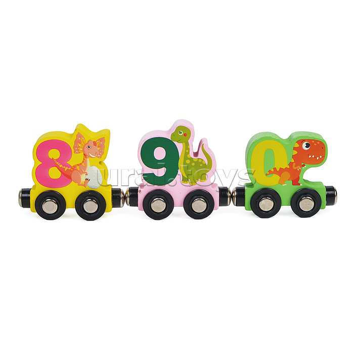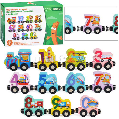 Игрушка включает 11 разноцветных вагончиков, каждый из которых украшен цифрой от 0 до 9 и один паровозик