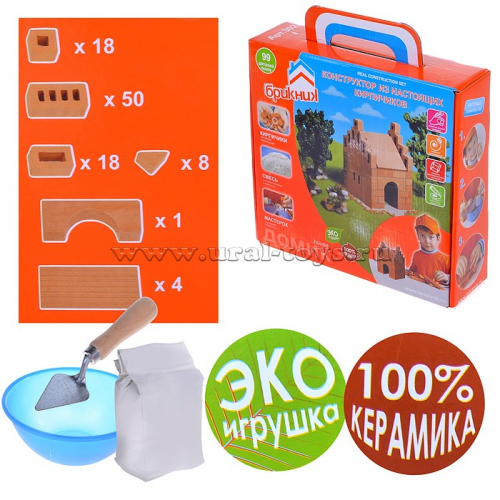 - Набор содержит 514 кирпичиков разной формы из натуральной глины и строительную смесь, с помощью которой ребёнок сможет создать замок или придумать свою оригинальную постройку из кирпичиков.