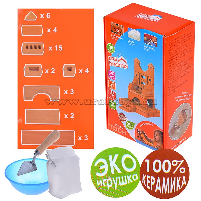 • Кроме того, в наборе конструктора «Трон» от Brickmaster – строительная смесь из кукурузного крахмала и песка, которая подойдет в качестве «цемента», а также мастерок из качественного металла и дерева.