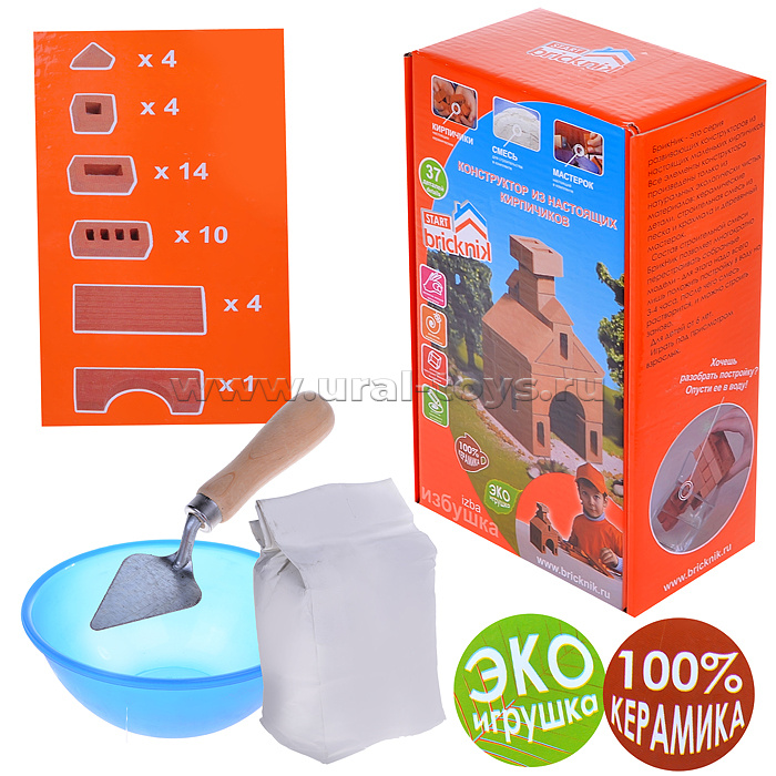 Конструктор из кирпичиков «Избушка» сделан из материалов, используемых при изготовлении настоящих кирпичей. В набор входят маленькие кирпичики, созданные из безопасных и экологически чистых материалов, настоящий маленький мастерок и смесь для закрепления конструкции. Конструктор позволяется создавать объемные сооружения под присмотром взрослых, которые должны контролировать действия ребенка, а также помочь с приготовлениями. Играть ребенок может самостоятельно или с друзьями, конструируя новые архитектурные сооружения, которые можно украсить, придумать для них сюжет.
