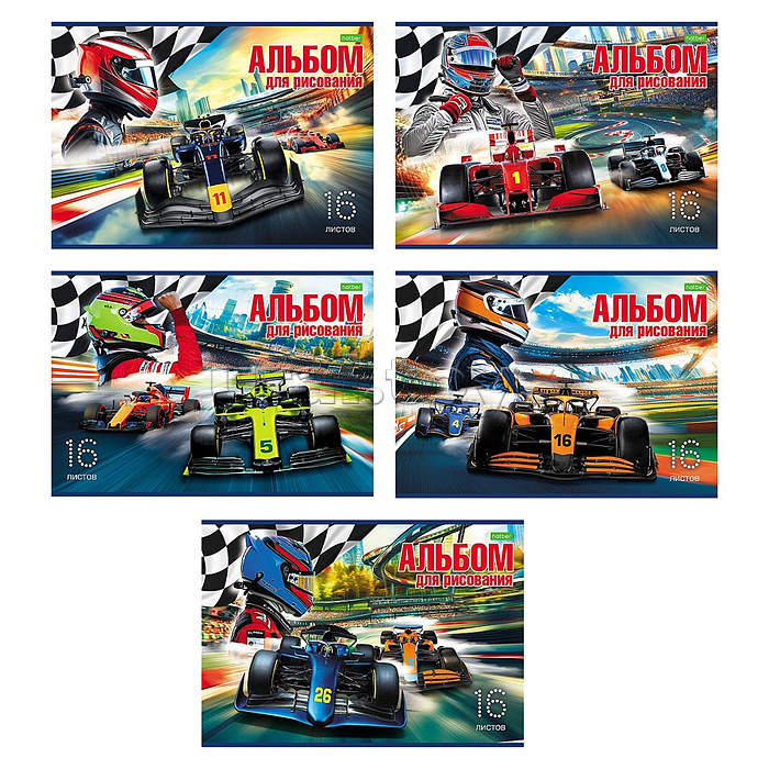 Альбом для рисования 16л А4ф "Гоночные машины" на скобе обложка офсет бумага 5 дизайнов в блок