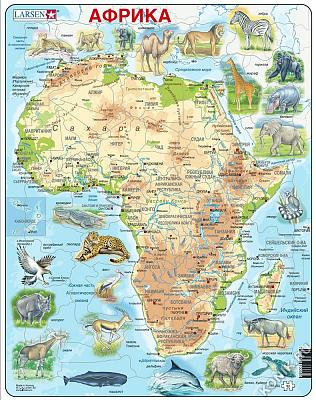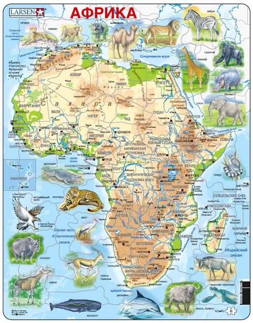 Красочный пазл норвежской фирмы Ларсен поможет ребенку интересно провести время и изучить страны, животных и очертания африканского континента. Русифицированный пазл состоит из большого количества элементов, на которые нанесены надписи крупных городов и изображения животных, рельефа, прибрежной территории. _x000D_ _x000D_ Пазл Ларсен Африка станет прекрасным дидактическим пособием на уроках географии и естествознания, поможет детям с большим увлечением заниматься дома дополнительными уроками в интересной форме. _x000D_ _x000D_ В наборе: 63 элемента пазла. _x000D_ Размер собранного поля - 36,5 х 28,5 см. _x000D_ _x000D_