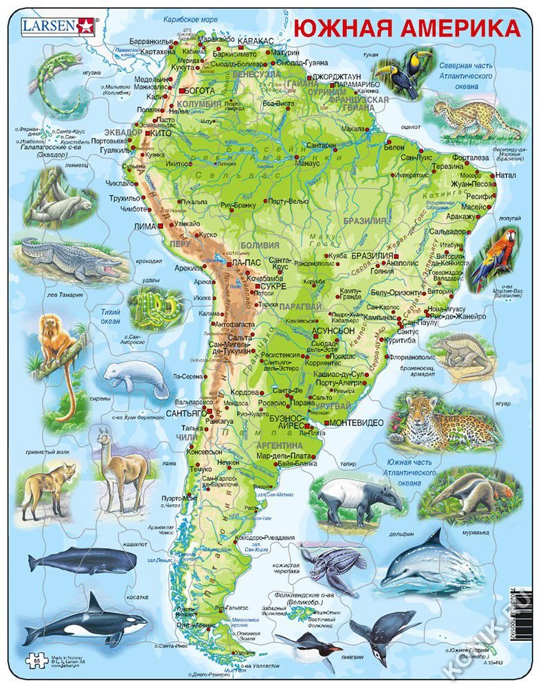 С помощью красочного пазла ребенок сможет познакомиться с теплыми странами Южной Америки и ее обитателями. На деталях пазла изображен рельеф, нанесены надписи крупных городов и рек, яркие реалистичные изображения птиц и животных дадут полное представление о флоре и фауне материка. _x000D_ _x000D_ Пазл Ларсен Южная Америка станет прекрасным дидактическим пособием на уроках географии и естествознания, поможет детям с большим увлечением заниматься дома дополнительными уроками в интересной форме. _x000D_ _x000D_ В наборе: 65 элементов пазла. _x000D_ Размер собранного поля - 36,5 х 28,5 см. _x000D_ Пазл Южная Америка русифицирован. _x000D_ _x000D_ Пазл Ларсен выполнен из плотного трехслойного картона, детали легко и прочно соединяются друг с другом, образуя единое красочное поле.