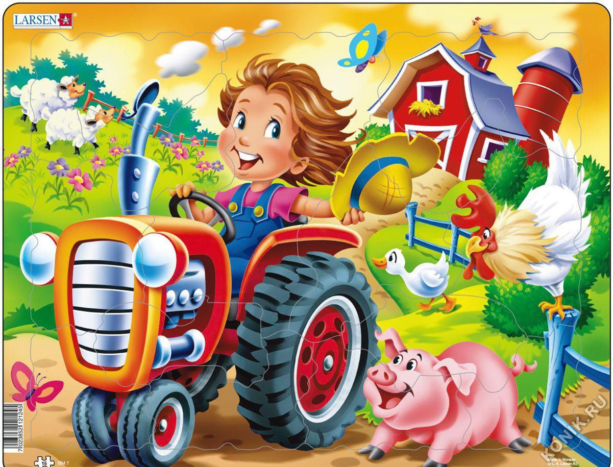 _x000D_ Новинка! Большой красочный пазл Larsen расскажет малышу об увлекательной жизни на ферме. На пазле изображен мальчик, катающийся на тракторе, а также множество дополнительных деталей и персонажей, которые делают сборку пазла еще более увлекательным занятием. По готовому изображению можно составить развернутый рассказ с упоминанием представленных героев._x000D_ _x000D_ _x000D_ Пазл Larsen выполнен из прочного многослойного картона, детали удобно брать в ручки и соединять между собой. Игровой пазл можно использовать много раз, собирая и разбирая картинку._x000D_ _x000D_ _x000D_ Игра с пазлами развивает мелкую моторику рук, внимание, логическое мышление и творческое воображение. _x000D_ _x000D_ В наборе: 15 элементов пазла. _x000D_ Размер собранного поля - 36,5 х 28,5 см.