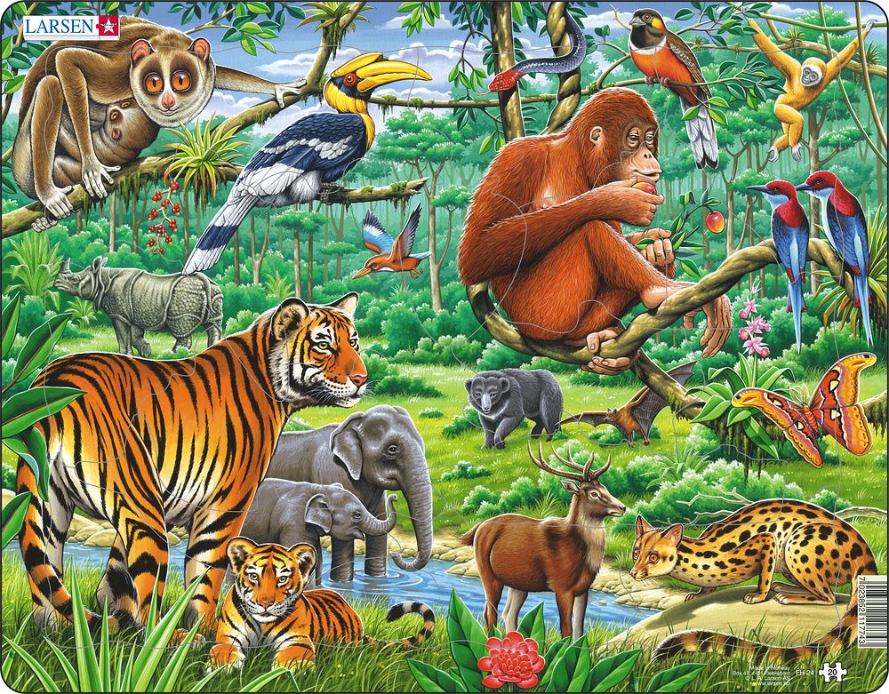 Пазлы Ларсен - это прежде всего обучающие пазлы. Яркая серия Флора и Фауна предназначена для детей от 6 лет. _x000D_ _x000D_ На пазле представлен животный мир азиатских джунглей. _x000D_ Виды: тонкий лори, большой двурогий калао, красноголовый крайт, краснозатылочный азиатский трогон, белорукий гиббон, индийский носорог, красноклювая альциона, орангутан, синегорлая щурка, тигр, индийский слон, малайский медведь, индийская летучая лисица, павлиноглазка атлас, замбар, пятнистый линзанг, этлингера высокая (цветок). _x000D_ _x000D_ С фотографической точностью прорисованы обитатели и растительный мир самых отдаленных уголков планеты. Многообразие форм вырубки и различные размеры отдельных элементов способствуют развитию мелкой моторики у малышей. Сделанные из высококачественного трехслойного картона, они не деформируются и легко берутся в руки. Все пазлы снабжены специальной подложкой, благодаря чему их удобно собирать. _x000D_ _x000D_ Красочный пазл станет замечательным оригинальным подарком, которым можно пользоваться не один раз. _x000D_ _x000D_ В наборе: 20 элементов пазла._x000D_ Размер собранного поля - 36,5 х 28,5 см.