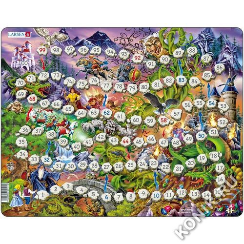 Оригинальный пазл в виде игры – бродилки – это и красочный пазл и интересная настольная игра._x000D_ _x000D_ Бросайте кубики и отправляйтесь в увлекательное путешествие, Ваша цель – сказочный замок. Ваш путь будет пролегать через волшебный лес, полный сказочных персонажей – летучих мышей, троллей, рыцарей, драконов и эльфов. По пути вас могут ждать сюрпризы, если вы попадаете на красную стрелку – вам необходимо вернутся на пару ходов назад, а если вы попадаете на синюю стрелку – то можно продвинуться вперед. _x000D_ _x000D_ Соберите пазл и пройдите путь от 1 до 100! Кто окажется первым в замке?_x000D_ _x000D_ Процесс собирания разноцветных деталей пазла способствует развитию мелкой моторики рук, развивает логическое мышление и внимательность. _x000D_ _x000D_ Различные формы вырубки и размеры деталей пазлов Larsen делают эти пазлы невероятно интересными и полезными для детей разных возрастов. Пазлы Ларсен выполнены из трехслойного картона высокого качества, не деформируются, удобны для маленьких детских ручек. _x000D_ Пазлы оснащены подложкой, благодаря чему ребенку их удобно собирать._x000D_ _x000D_ В наборе: 40 элементов пазла._x000D_ Размер собранного поля - 36,5 x 28,5 см.