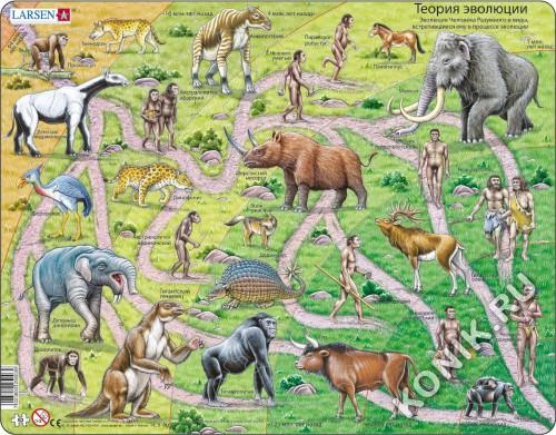 Пазлы Ларсен - это прежде всего обучающие пазлы. Многообразие форм вырубки и различные размеры отдельных элементов способствуют развитию мелкой моторики у малышей. Сделанные из высококачественного трехслойного картона, они не деформируются и легко берутся в руки. Все пазлы снабжены специальной подложкой, благодаря чему их удобно собирать. _x000D_ _x000D_ Яркие и оригинальные пазлы норвежского бренда Ларсен радуют детей и взрослых. Каждый пазл - настоящая картина, которую необходимо собрать, чтобы восхищаться удивительными животными и птицами. Пазл от обезьяны до человека рассказывает об истории происхождения жизни на земле. _x000D_ _x000D_ Пазлы Ларсен всесторонне влияют на развитие малыша. В процессе игры с мелкими деталями развивается моторика пальчиков, красочные картинки стимулируют воображение, мышление и память. _x000D_ _x000D_ В наборе: 83 элемента пазла. _x000D_ Размер собранного поля - 36,5 х 28,5 см.