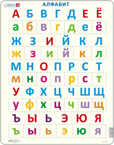 Пазлы Ларсен - это прежде всего обучающие пазлы. Серия Алфавит в игровой форме знакомит детей от 3 лет с буквами и их последовательностью в алфавите. _x000D_ _x000D_ Детям необходимо в правильном порядке расставить все буквы внутри пазла. В качестве подсказки на пазле указана нужная буква другого цвета. Заодно ребенок сможет изучить или повторить различные цвета. _x000D_ _x000D_ Многообразие форм вырубки и различные размеры отдельных элементов способствуют развитию мелкой моторики у малышей. Сделанные из высококачественного трехслойного картона, они не деформируются и легко берутся в руки. Все пазлы снабжены специальной подложкой, благодаря чему их удобно собирать. _x000D_ _x000D_ В наборе: 33 элемента пазла. _x000D_ Размер собранного поля - 36,5 х 28,5 см.
