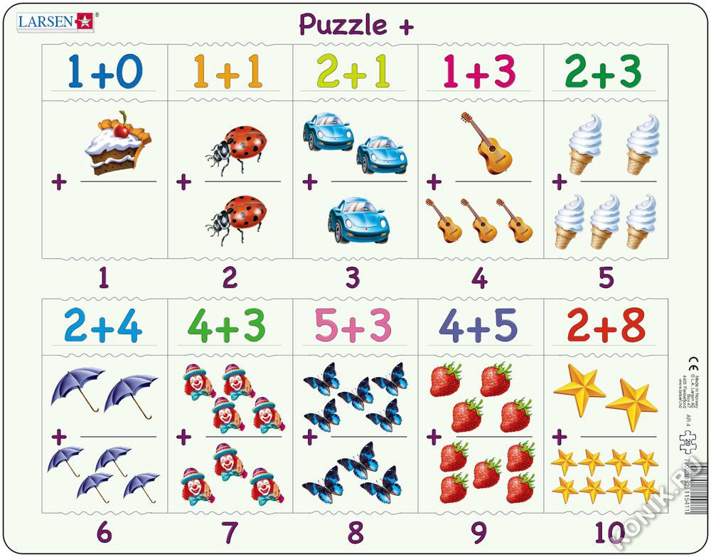 Пазлы Ларсен - это прежде всего обучающие пазлы. "Пазл плюс" относится к серии "Математика" и предназначен для самых маленьких . На картоне отпечатаны числа от 1 до 10 , и детям необходимо правильно разместить вырубленные примеры со сложением символов или чисел.