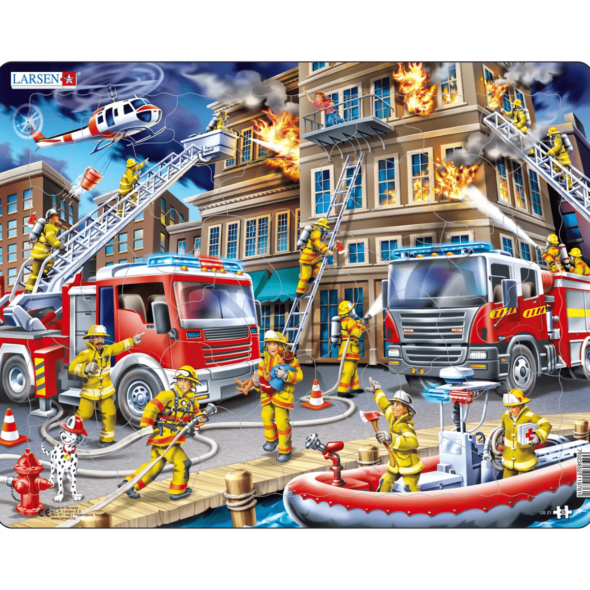 Красочный пазл изображает сцену тушения пожара. Отважные пожарные раскручивают пожарный шланг, поднимаются на выдвижной лестнице на верхний этаж, чтобы спасти человека, бегут на помощь пострадавшим с аптечкой, пожарный вертолет также участвует в этом опасном и героическом деле. _x000D_ _x000D_ Многообразие форм вырубки и различные размеры отдельных элементов способствуют развитию мелкой моторики у малышей. Сделанные из высококачественного трехслойного картона детали пазла не деформируются. Малышам удобно брать их в руки. Все пазлы снабжены специальной подложкой, благодаря чему их удобно собирать. _x000D_ _x000D_ В наборе: 45 элементов пазла. _x000D_ Размер собранного поля - 36,5 х 28,5 см.
