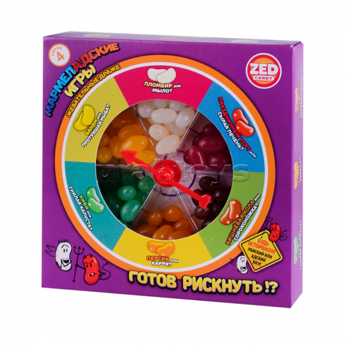 Помимо жевательных бобов в набор входит игровое поле со стрелкой, поделенное на сектора с конфетами одного цвета.