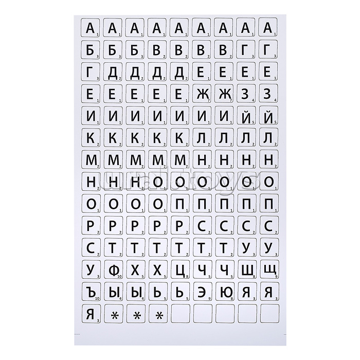 - 125 фишек (118 с буквами, 3 джокера, 4 запасные).