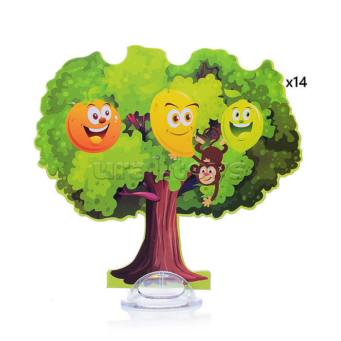В комплекте: 15 картонных деревьев на опорах, 12 обезьян, 3 кубика, а также зоны старта и финиша.