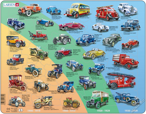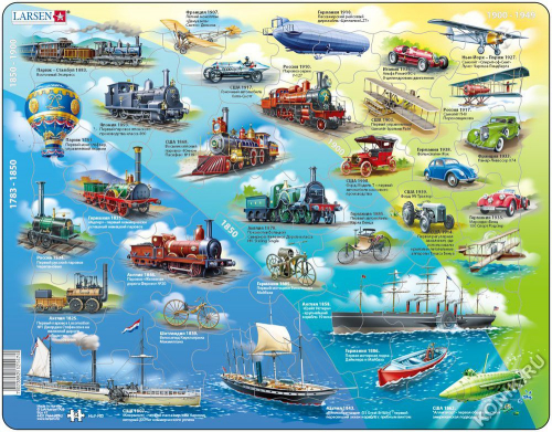 Пазл История транспорта Larsen – великолепный обучающий пазл от известного норвежского производителя. _x000D_ _x000D_ Исторические виды транспорта прорисованы тщательно и детально, и поэтому вызовут большой интерес у ребенка. Под каждым видом транспорта есть надпись, рассказывающая, в каком году и в какой стране он был изобретен – это стимулирует интерес ребенка к истории. Многообразие форм вырубки и различные размеры отдельных элементов способствуют развитию мелкой моторики у малышей. Сделанные из высококачественного трехслойного картона, элементы пазлов не деформируются, их легко брать в руки. _x000D_ _x000D_ Все пазлы снабжены специальной подложкой, благодаря чему их удобно собирать. _x000D_ _x000D_ В наборе: 54 элементов пазла. _x000D_ _x000D_ Размер собранного поля - 36.5x28.5 см.