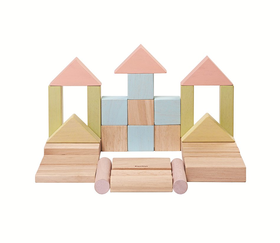 В наборе 40 блоков пастельных цветов с 6 разными геометрическими формами.