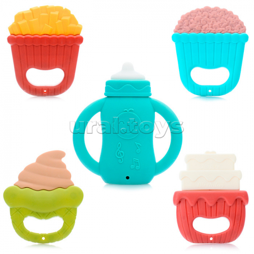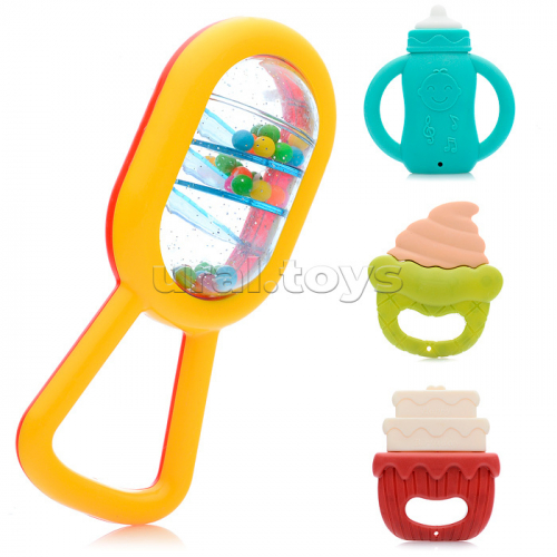 В наборе: 1 игрушка-погремушка, 4 прорезывателя.