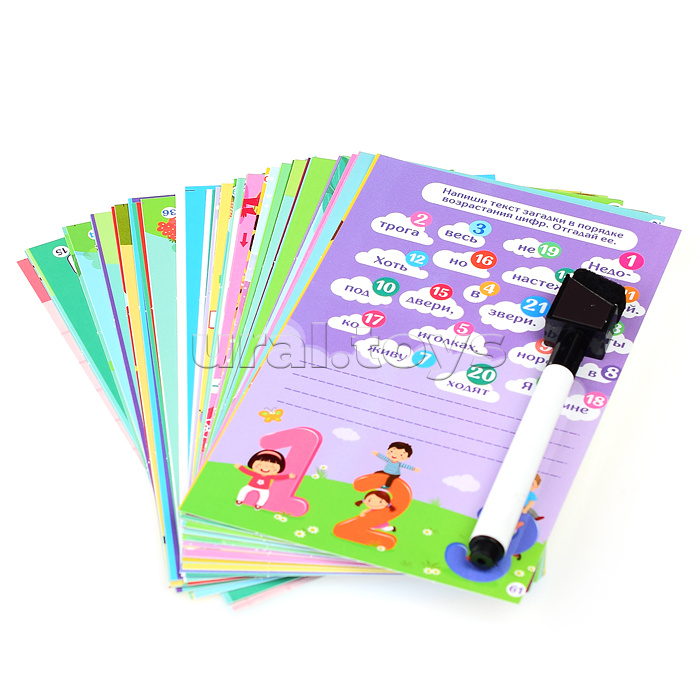 Состав: 36 многоразовых двусторонних карточек из ламинированного картона (71 задание) размером 15,5х9,8 см, маркер на водной основе со стирающей губкой.