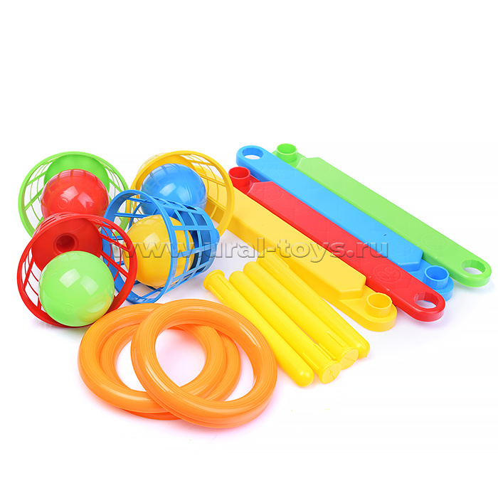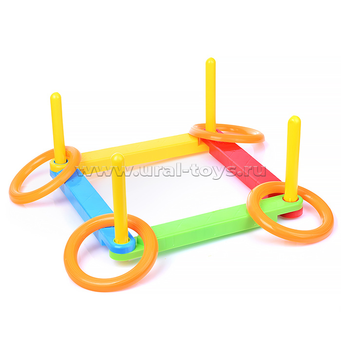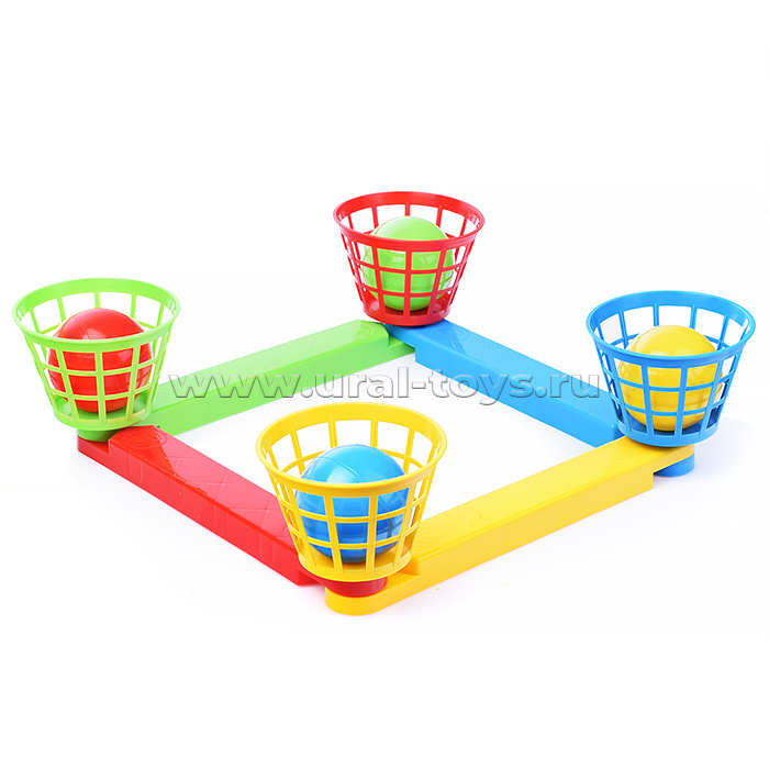 Кольцеброс с корзинками – это детская ига с мячикоми и кольцами, где смысл игры заключается в попадании мячика в заданную цель (корзину), а колечки на палочку. Спортивная игра в детский кольцеброс разовьёт у ребенка концентрацию внимания, улучшит точность глазомера, координация движения станет лучше. Кольцеброс с корзинами и мячиками поднимет настроение и спортивный дух вашему ребенку. Изготовлена игра кольцеброс из нетоксичного яркого пластика. В набор входит: 4 перекладины (30,5х3,8х2,3 см.), 4 корзинки (диаметр 11 см.; высота 7.5 см.), 4 штырька (16 см.), 4 шарика (6,5 см.), 4 колечка (13,5 см.).