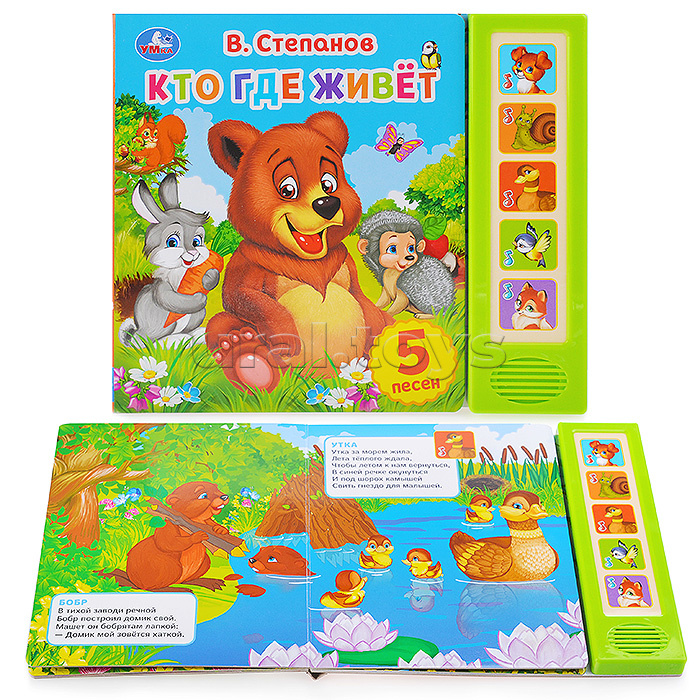 • В этой книжке Вы с вашим ребёнком прочитаете стихи В. Степанова о животных. • Крупные и красочные иллюстрации созданы специально для того, чтобы малыш их внимательно рассматривал и знакомился с разными животными. • А с помощью кнопок книжки малыш сможет самостоятельно прослушать песенки. • Формат: 20 х17,5 см. • Количество страниц: 10. • При нажатии на картинки с нотками звучат 5 песенок. • Зауковой модуль работает от 3-х батареек типа LR44. • Элементы питания входят в комплект. • Материал: картон. • Соответствует требованиям безопасности продукции. • Для чтения взрослыми детям (категория 0+).