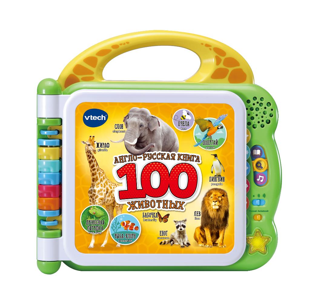 Англо-русская книга VTech с электронными картинками, нажимая на которые, ребёнок узнает 100 животных со всего мира! _x000D_ _x000D_ Обучение и игра возможны сразу на 2-х языках: русском и английском. Запоминать слова, нажимая на интерактивные картинки – это так весело! Благодаря красочным иллюстрациям ребёнок с удовольствием будет листать и изучать страницы книги. Помимо названий животных, можно узнать про их среду обитания – от ночного леса до саванны, послушать звуки, которые издают животные, а также разучить 3 короткие песенки на русском и английском языках. _x000D_ _x000D_ В игрушке 3 режима игры: названия животных, интересные факты и веселые звуки. 12 интерактивных страниц в билингвальном режиме! На корпусе книжки есть ручка, за которую ребенку будет комфортно держать книгу._x000D_ _x000D_ Книга гарантированно заинтересует родителей и порадует ребёнка. Кстати, и родители смогут проверить свои знания в английском или вместе с ребёнком весело повторить слова. _x000D_ _x000D_ Размеры: 279 х 300 х 65мм Потребуются 2 АА батарейки_x000D_ _x000D_ В 2020 году англо-русская книга VTech «100 Животных» успешно прошла тестирование амбассадорами всероссийской организации «Совет матерей». Мамы-участницы проверяли страницы книги на прочность, оценивали качество англо-русского контента, наблюдали за эмоциями ребёнка и в итоге — остались довольны! Игра получила почетный знак от организаторов конкурса._x000D_ _x000D_ Компания VTech – лидирующий поставщик электронных обучающих игрушек для детей. Цифровые игрушки и товары для детей Витек позволяют детям развивать свои творческие навыки, креативность, способность изучать окружающий мир, учиться читать и считать.