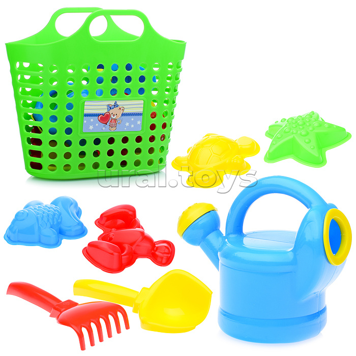 Детский песочный набор 8 пр (сумка-корзина, лейка-мини, совок, грабли, формы 4 шт)
