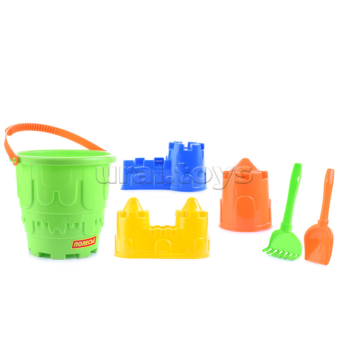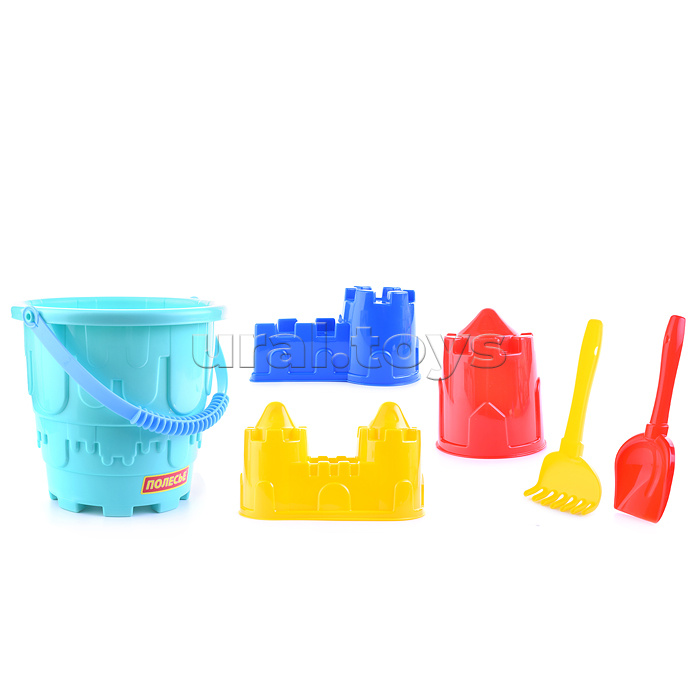 Набор №524: Ведро-замок большое, лопатка №5, грабельки №5, формочки (замок башня + замок стена с двумя башнями + замок мост)