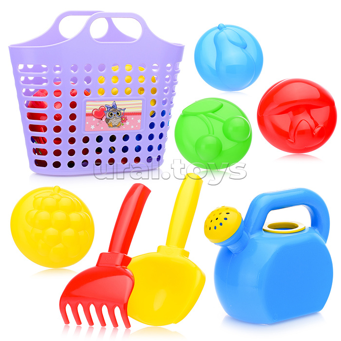 Песочный набор в корзинке "Садовый " ( 4 формочки, совок, грабли, леечка )