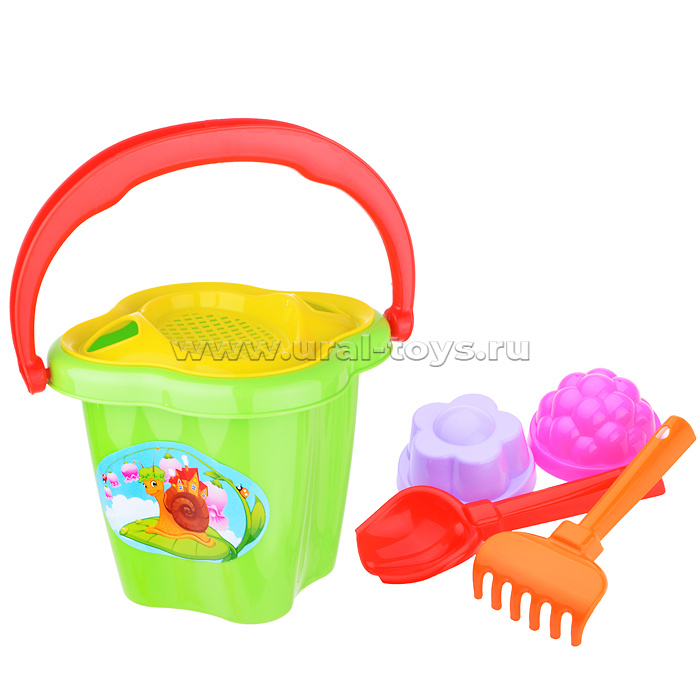 Набор №36: ведро-цветок среднее, ситечко-цветок, совок №2, грабельки №2, 2 формочки