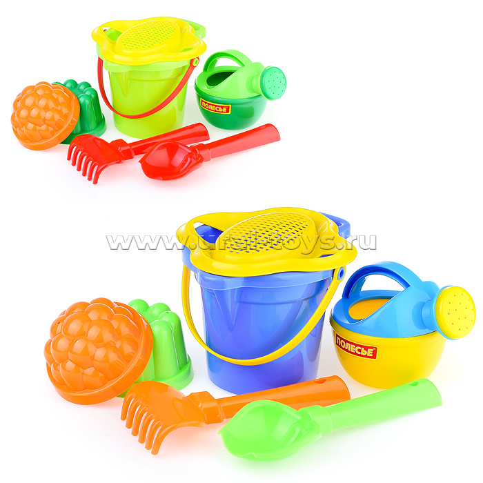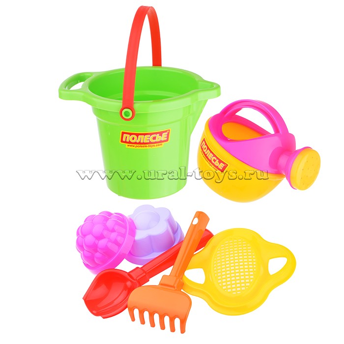 Набор №349: ведро малое с носиком, ситечко-цветок, совок №2, грабельки №2, 2 формочки, лейка малая №3