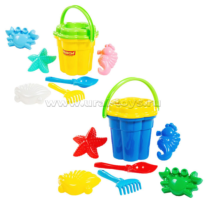 Набор №362: ведро-цветок большое, ситечко-цветок большое, лопатка №5, грабельки №5, формочки (краб №1 + морской конёк + морская звезда №1 + ракушка №1)