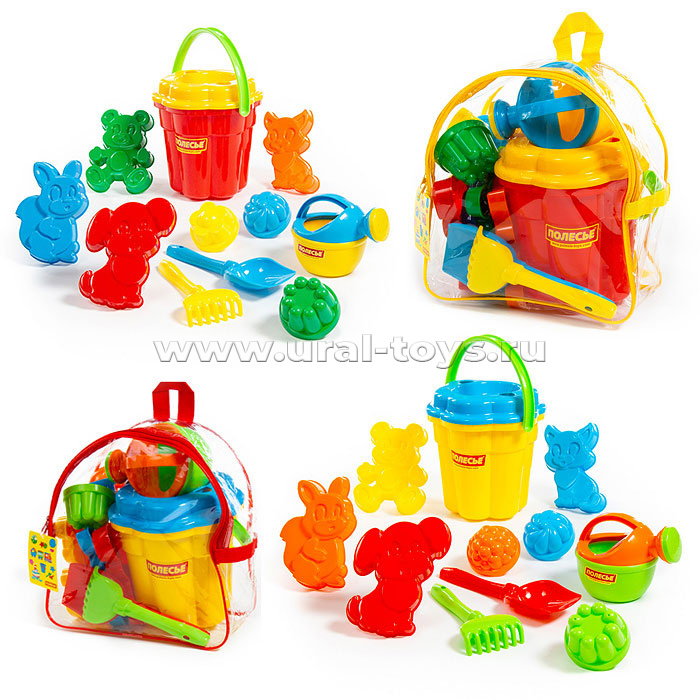 Набор №168 (в рюкзаке): ведро-цветок большое, ситечко-цветок большое, лопатка №5, грабельки №5, формочки (белочка + пёсик + котёнок + медведь), 3 формочки, лейка малая №4