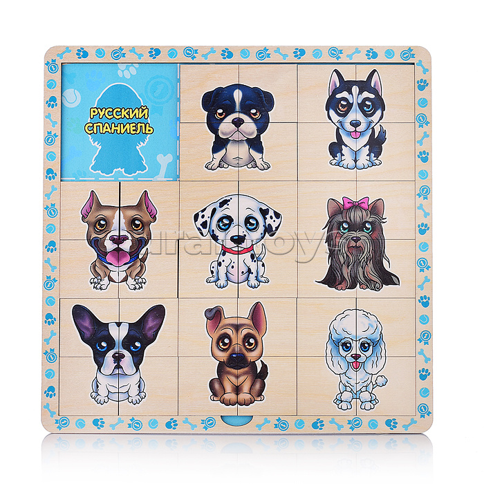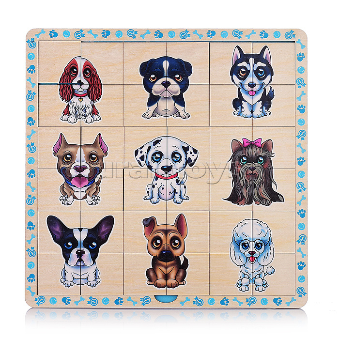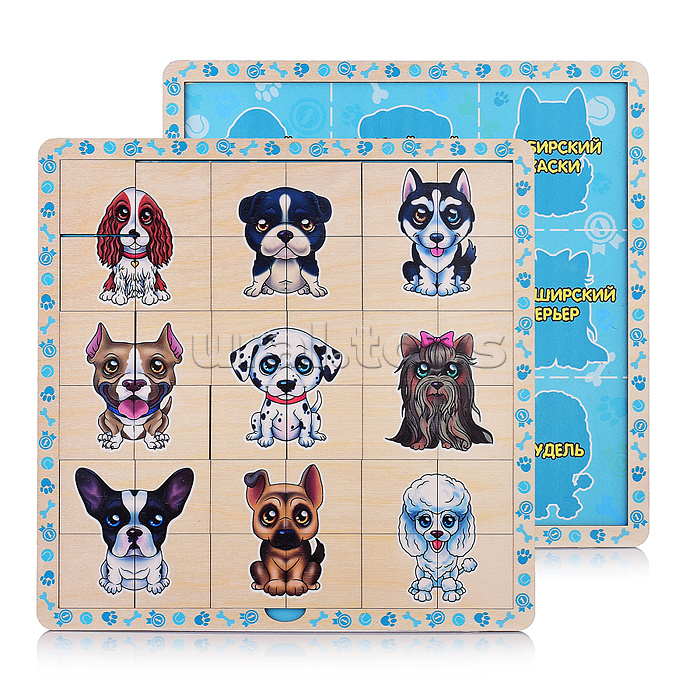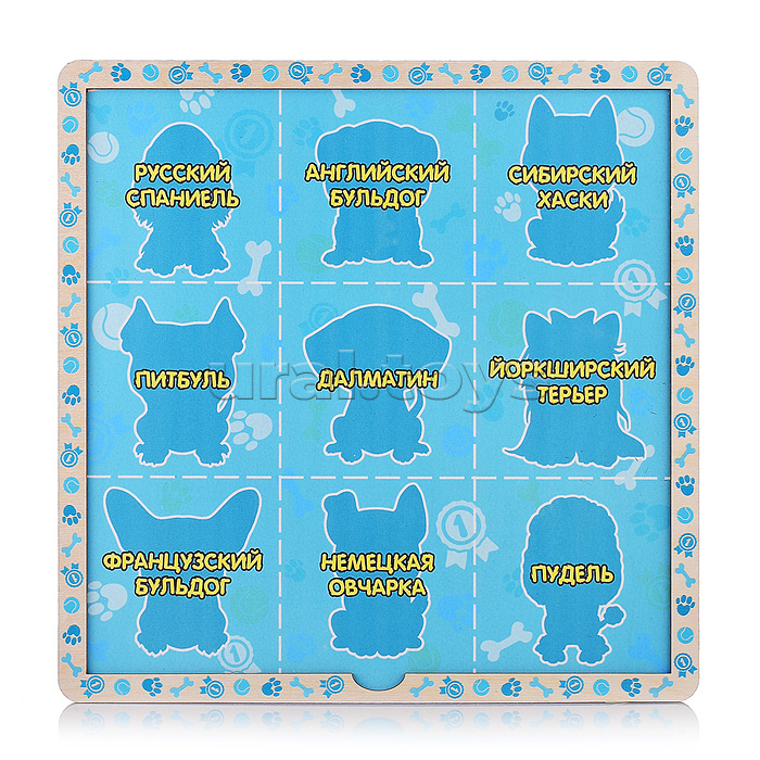 Min заказ: 1шт. Оригинальная деревянная игра Забавные песики состоит из подложки и 36 квадратных деталей. Из деталей можно составить 9 картинок собак разных пород. На подложке нанесены силуэты картинок и подписаны названия пород. В процессе игры можно обсудить с ребенком, чем похожи и чем отличаются собаки разных пород.