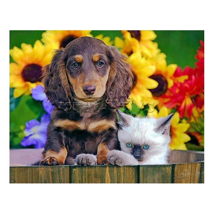 Холст с красками 30х40 по номерам "Собачка и котёнок в деревянном корытце" (20цв.)