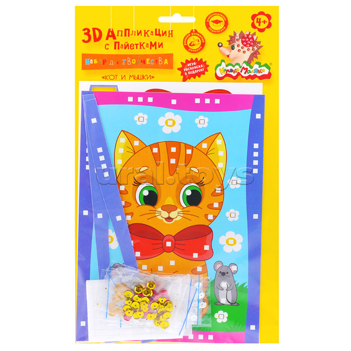 В наборе картинка на картоне А5, вырезанные картонные детали, 6 цветов пайеток разной формы, самоклеящиеся элементы.