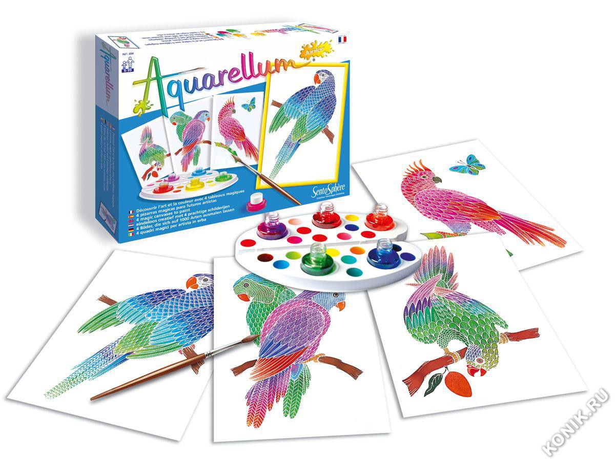 Акварель для детей основана на технике вставки в оправу тонкого пергамента. Эта техника позволяет картине приклеиться только на специальные поверхности: рисунок появляется по мере проведения кисточкой по бумаге. Картину можно перерисовывать несколько раз, чтобы получить самый красивый результат. Такая техника идеальна, чтобы научить детей составлению цветов. Кроме того, она развивает воображение, точность и внимание.