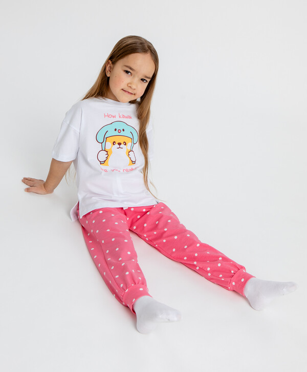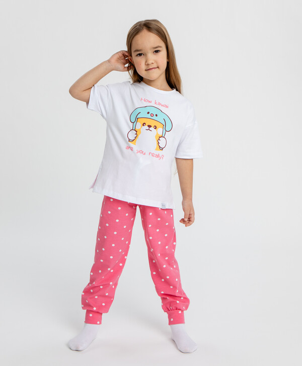 Пижама с принтом. Этот комплект станет отличным выбором для комфортного сна маленькой принцессы. Белая футболка с коротким рукавом и милым принтом, а также яркие джоггеры в горошек создают эффектный образ даже в стенах дома. Изготовлена из качественных материалов - 95% хлопок и 5% эластан. Такой состав обеспечивает максимальный комфорт и долговечность изделия. А пояс на резинке позволяет регулировать посадку штанов, чтобы избежать сдавливания.
