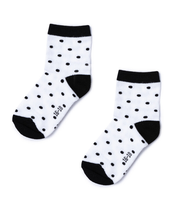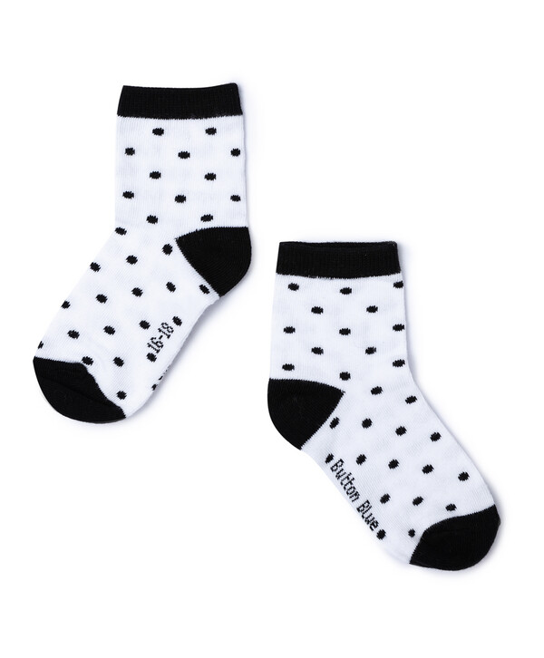 Комплект детских носков из двух пар для девочки. Носочки выполнены из хлопка с небольшим добавлением полиамида и эластана, что обеспечивает хорошую растяжимость с сохранением формы, а также оптимальный воздухообмен, что позволяет ногам дышать. Оптимальная длина и эластичная резинка будут способствовать комфорту. Белые носки в горошек и фиолетовые носки с контрастным мысом, верхом и пяткой порадуют юную модницу. Комплект носков средней длины от Баттон Блю позволит украсить и разнообразить стильные образы для дома, улицы и детского сада.