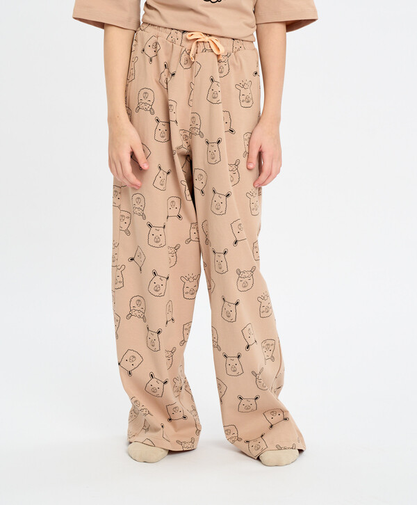 Домашние брюки для девочки выполнены из смесового материала джерси с хлопком в основе. Модель мягкая, дышащая и приятная тактильно – идеально для детской кожи и продолжительной носки. Комфортный крой без прилегания, широкие брючины дарят свободу движений. Пояс пижамных брюк выполнен на резинке с завязкой для идеальной посадки. Есть два кармана для удобства. Домашние штаны для девочки в светло-коричневом цвете дополнены принтом в виде альпак по всему изделию. Подойдут для сна, носки дома, для прогулок и отдыха на природе.