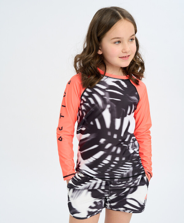 Лонгслив для купания для девочки и мальчика сделан из эластичного материала, который легко снимать и надевать даже мокрым. Детская гидрофутболка быстро сохнет и хорошо держит форму даже после контакта с агрессивной соленой водой. Круглый вырез удобный, швы плоские и надежные, крой комфортный полуоблегающий. Футболка для плавания с длинным рукавом подойдет для бассейна и пляжа. Она понравится и мальчику, и девочке. Модель сочетает в себе яркие оранжевые рукава и черно-белый олловер принт в виде листов монстеры.