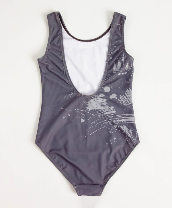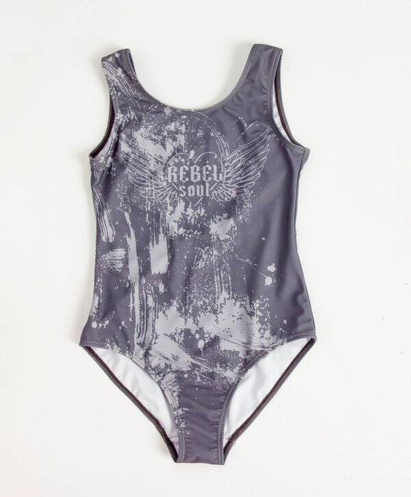 Слитный купальник для девочки темного серого цвета в оттенке жако дополнен принтом в стиле гранж и надписью. Модель смотрится дерзко и эффектно. Держится купальник для девочки на широких бретелях. На спинке есть U-образный вырез. Изделие идеально для пляжного отдыха и посещения бассейна. Детский купальник отлично тянется и быстро сохнет благодаря смесовому материалу.
