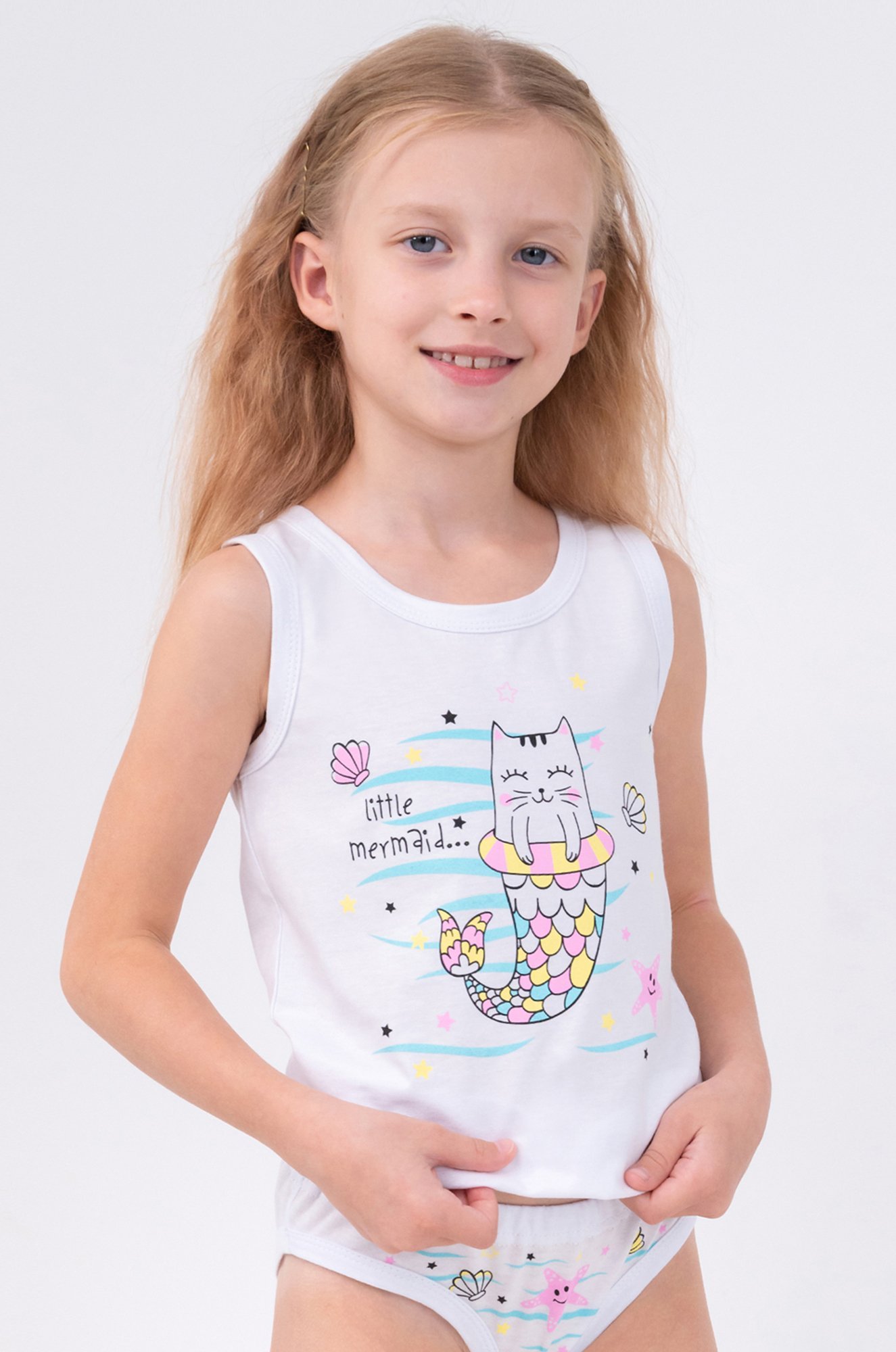 Мягкость, легкость и комфорт! Детский ..показатьнабор из майки и трусов слипов для девочки выполнен из натурального 100% хлопка. Белый комплект для детей станет любимым в гардеробе благодаря милому принту Котик-русалочка.