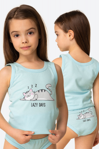 Бельевая майка для девочки выполнена и..показатьз хлопкового трикотажа с эластаном. Белая майка на бретелях в зоне декольте украшена красивым кружевом с рисунком Кошечки. Маечка для девочек-подростков очень мягкая и приятна к телу.