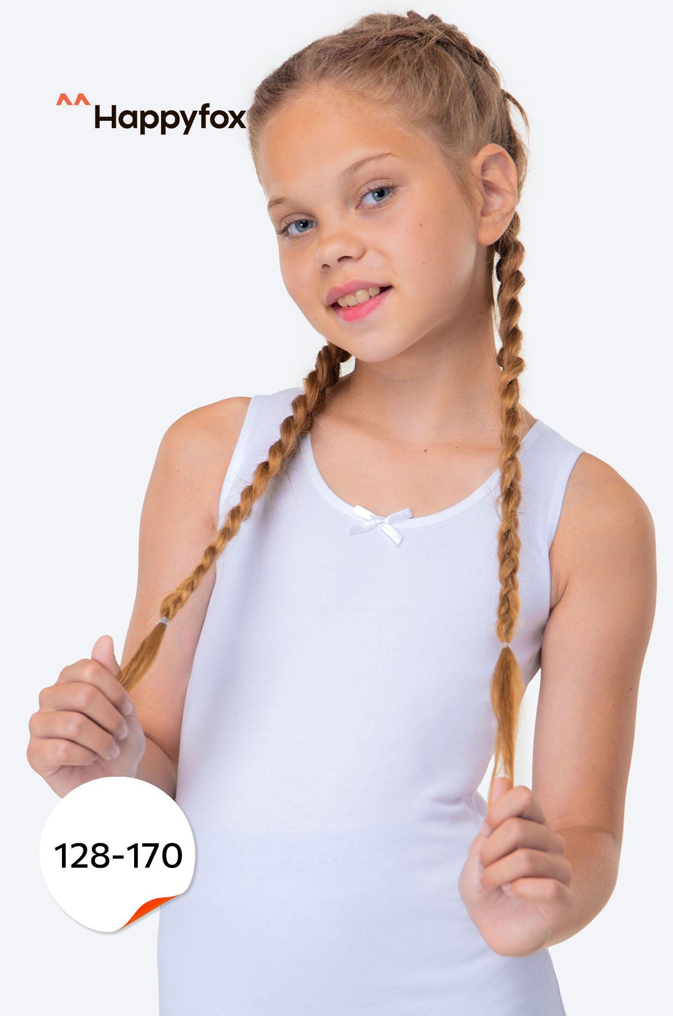 *замеры выборочные, могут незначительно отличаться. ровень! Белая майка на широких плечиках для девочек и девочек-подростков выполнена из трикотажа и украшена милым атласным бантиком.
