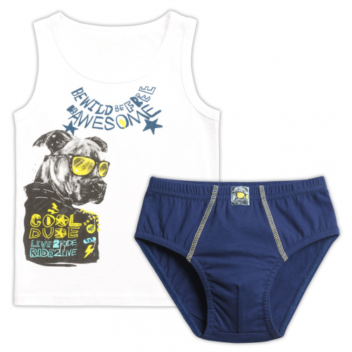Состав: верх: 100%хлопок, низ: 100%хлопокОписание: Комплект для мальчиков майка и трусы. Классическая майка на широких лямках. Трусы слипы. Декоративная отстрочка в области гульфика.