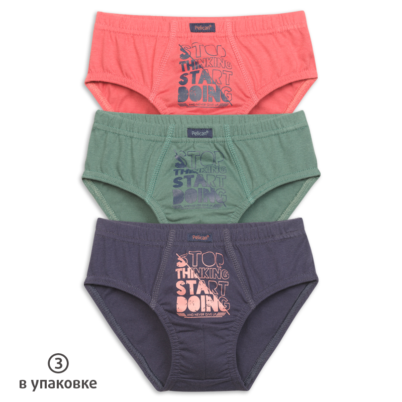 Состав: низ: 100%хлопок, низ2: 100%хлопок, низ:3 100%хлопокОписание: Трусы слипы для мальчиков. В комплекте 3 изделия. Декоративная обработка в области гульфика. Прочный принт. Перевод Хватит думать, начинай делать.