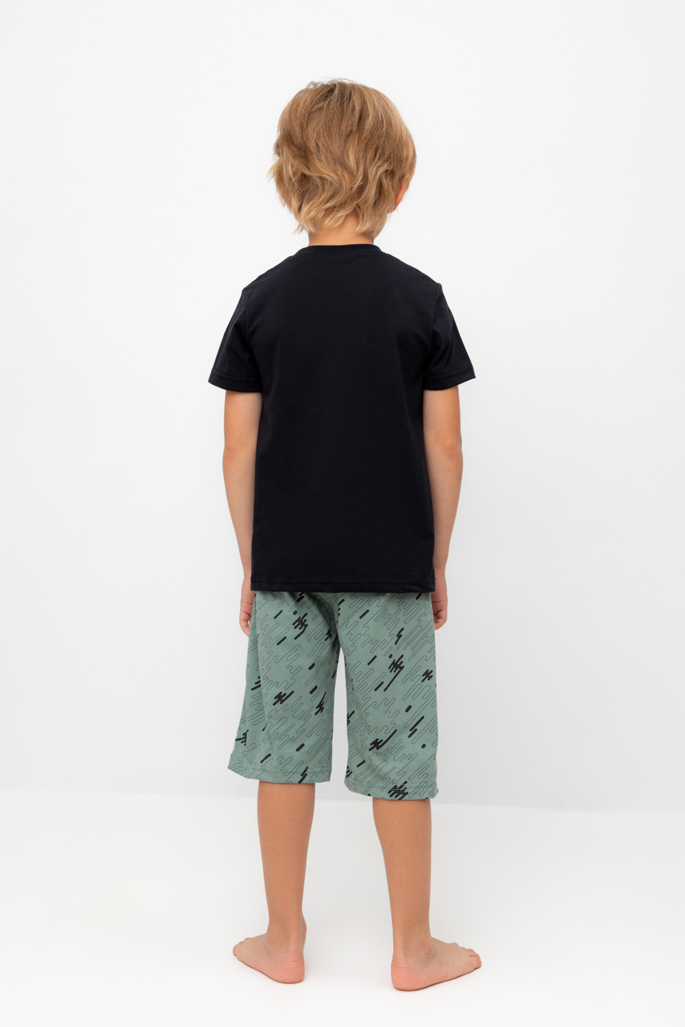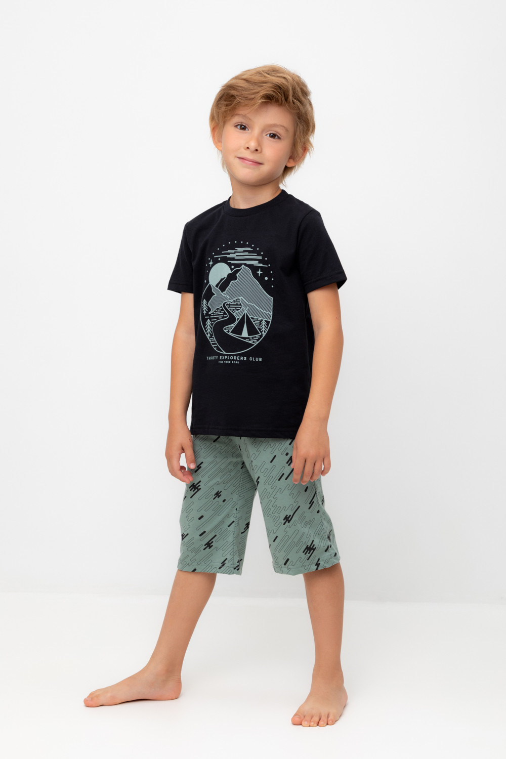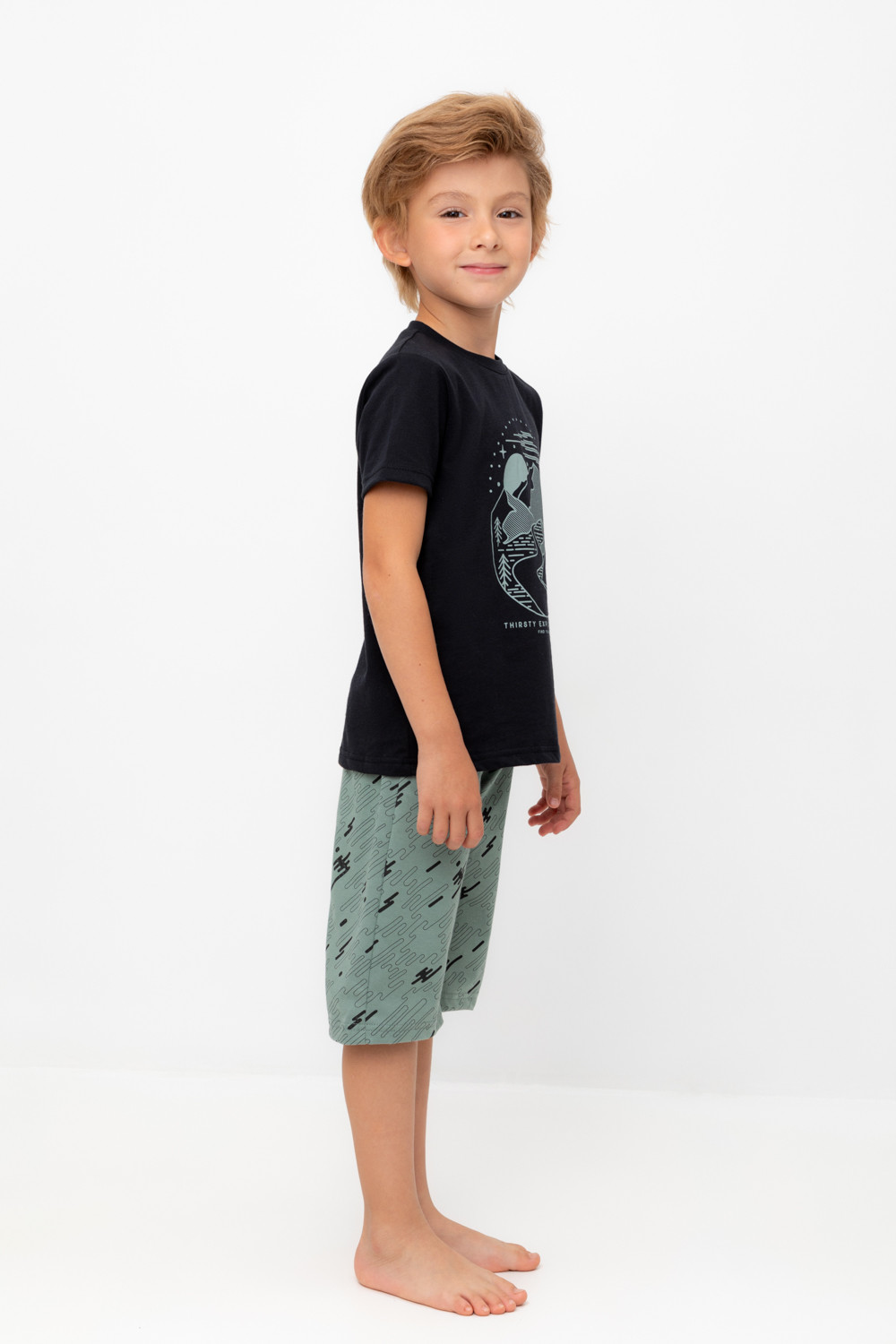 Трикотажная пижама из натурального хлопка. Футболка с короткими рукавами с принтом . У шорт эластичный пояс на резинке. Оригинальная набивка выполнена из стойких, гипоаллергенных текстильных красителей. Пижама сохраняет цвет и форму после многократных стирок. Все трикотажные полотна производятся в соответсвии с нормами Швейцарского сертификата ЭкоТекс.
