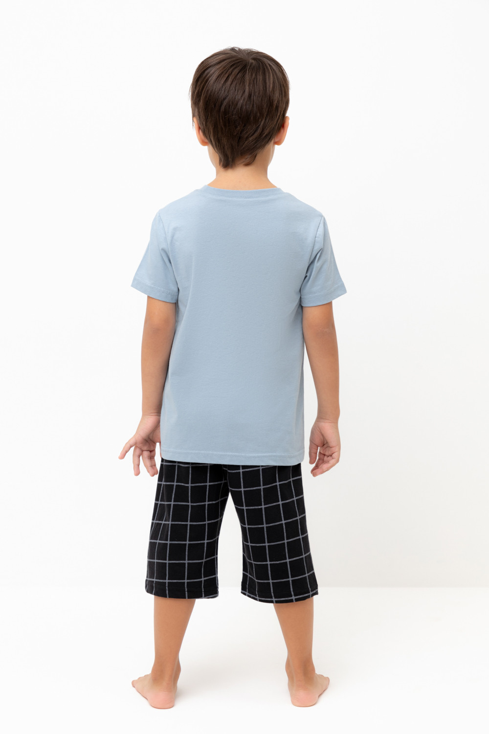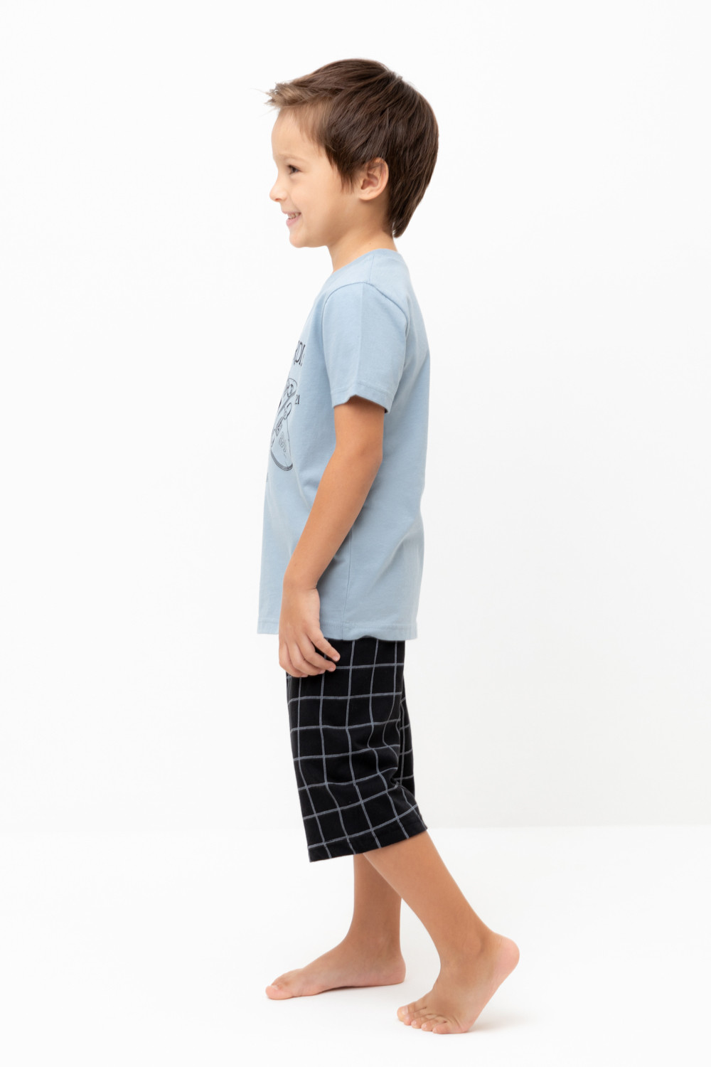 Трикотажная пижама из натурального хлопка. Футболка с короткими втачными рукавами и шорты с эластичной резинкой в поясе. Оригинальные набивка и принт выполнены из стойких гипоаллергенных текстильных гипоаллергенных красителей. Изделие сохраняет цвет и форму после многократных стирок. Все трикотажные полотна производятся в соответсвии с нормами швейцарского сертификата ЭкоТекс.